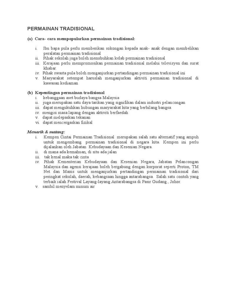 Namun demikian, permainan tradisional semakin dilupakan oleh generasi muda. Contoh karangan cemerlang pentingnya untuk terus popularkan permainan tradisional kepada . Kementerian pelancongan wajar melatih generasi muda untuk menjadi duta kecil untuk memperkenalkan permainan tradisional kepada pelancong asing. Huraikan peranan pelbagai pihak untuk . Ia menyentuh tema kebudayaan dan tradisi yang mencabar kemampuan pelajar untuk memberikan fakta serta menggunakan gaya bahasa yang menarik.